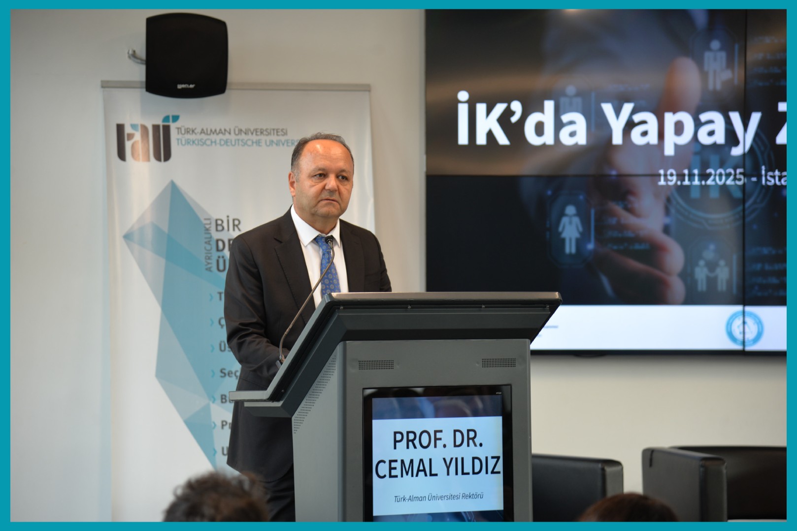 Açılış konuşmasını gerçekleştiren Rektörümüz Prof. Dr. Cemal Yıldız, üniversite-sanayi iş birliğinin Türk-Alman Üniversitesinin kalite politikasında hayati rol üstlendiğini ve AHK Türkiye ile yürütülen ortak çalışmaların bu iş birliğini daha da güçlendirdiğini ifade etti. Rektörümüz ayrıca, yapay zekânın insan kaynakları süreçlerinde stratejik önem taşıdığını belirterek zirvenin bu alandaki güncel bir temayı gündeme getirdiğini vurguladı.