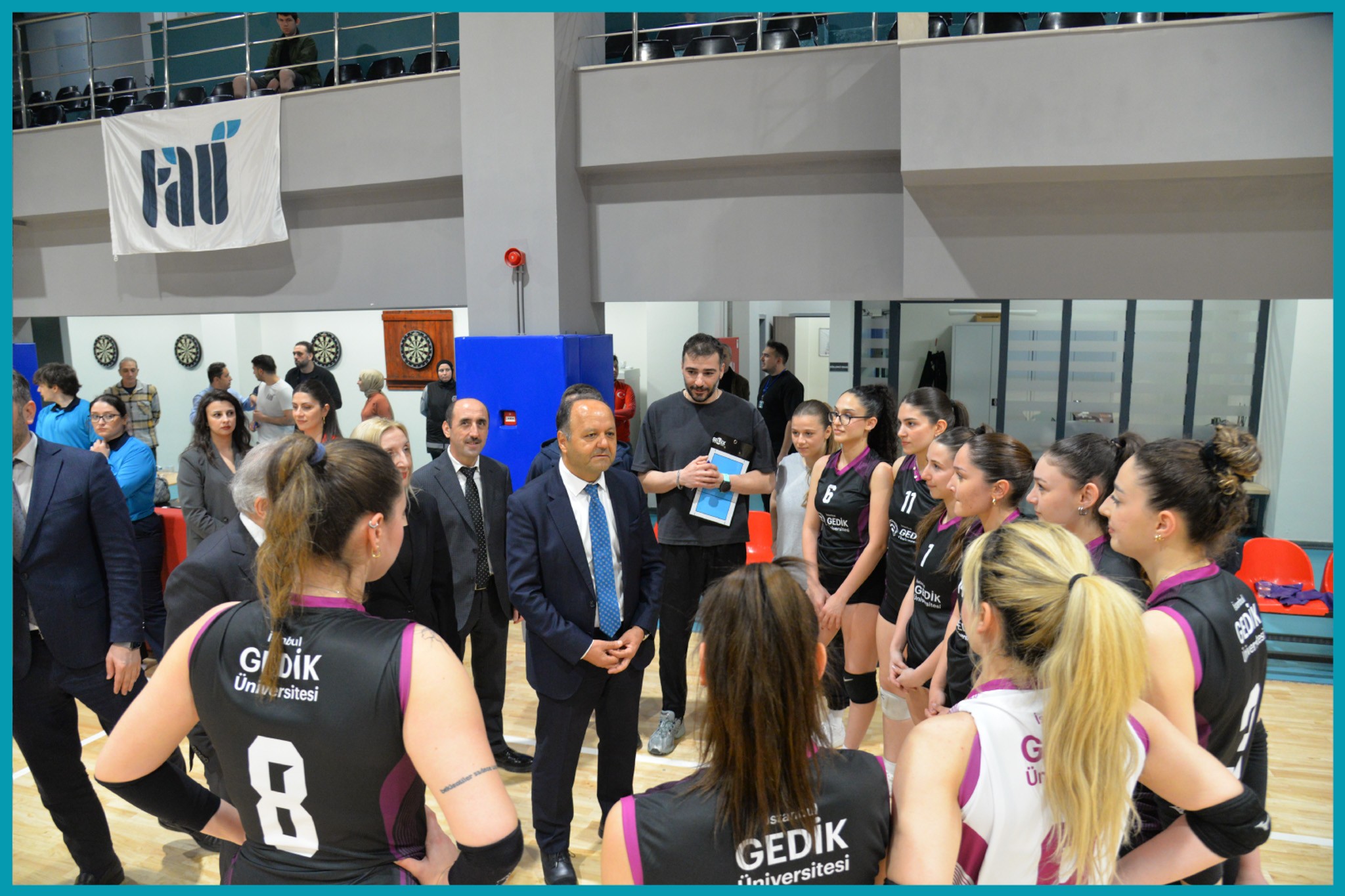 Müsabakalar sırasında Rektörümüz Prof. Dr. Cemal Yıldız da Spor Salonu’nu ziyaret ederek karşılaşmaları yerinde takip etti. Rektörümüz, maç aralarında sporcularla bir araya gelerek sohbet etti ve kendilerine başarı dileklerini iletti.