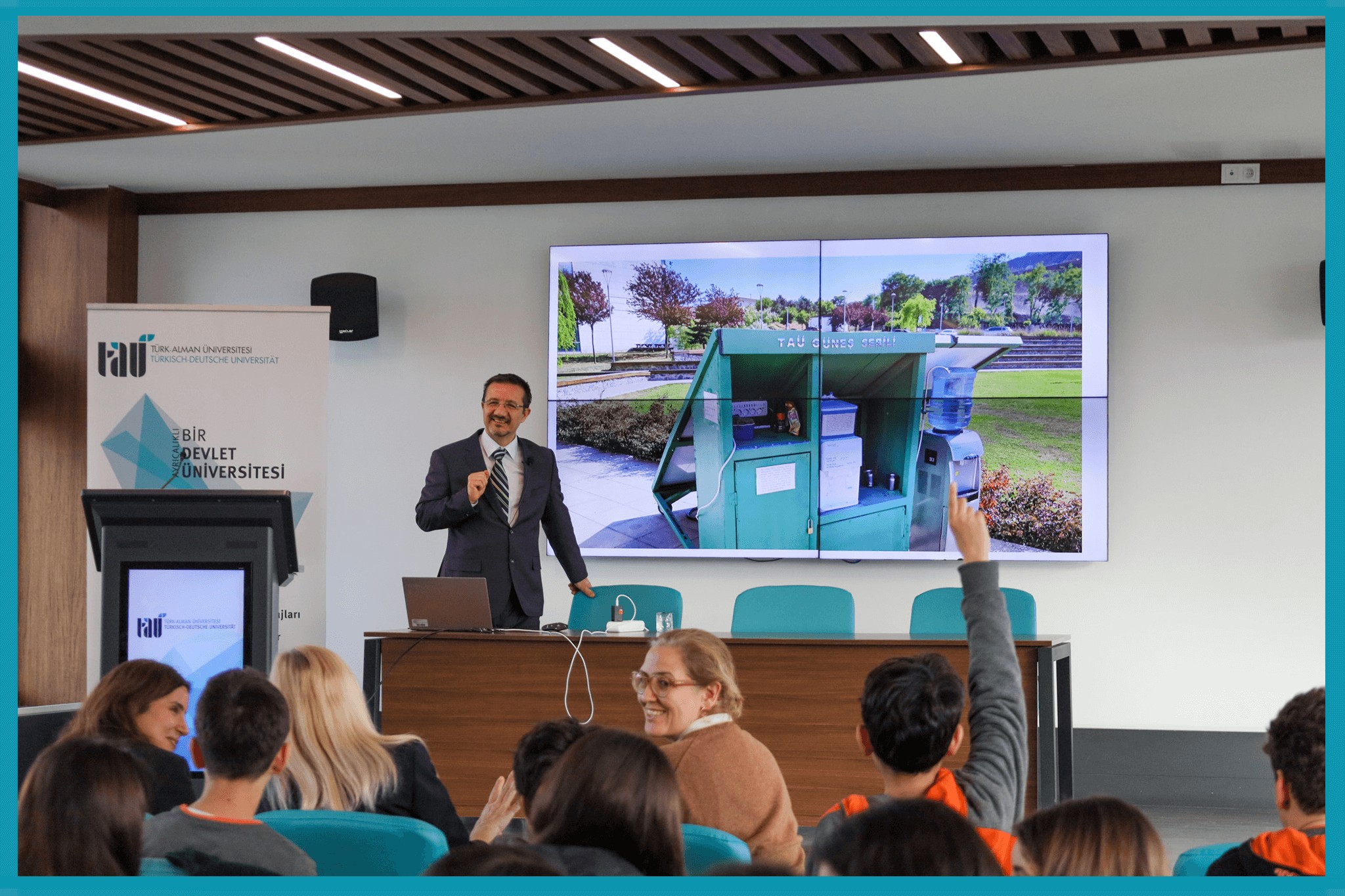 Etkinlik kapsamında Mühendislik Fakültesi Dekan Vekilimiz Prof. Dr. Murat Hamderi, “Fikirden Ürüne” başlıklı sunumunda Üniversitemiz bünyesinde geliştirilen Türk-Alman Güneş Sebili ve Havadan Yoğuşma ile Su Üretimi projelerini ele aldı. Prof. Dr. Hamderi, projelerin tasarım, geliştirme ve uygulama süreçlerini ayrıntılı biçimde aktardı, fikirden ürüne uzanan süreçte teknik ve uygulamaya yönelik zorluklar ile karşılaşıldığında bu zorluklara nasıl çözümler geliştirildiğini öğrencilerle paylaştı.