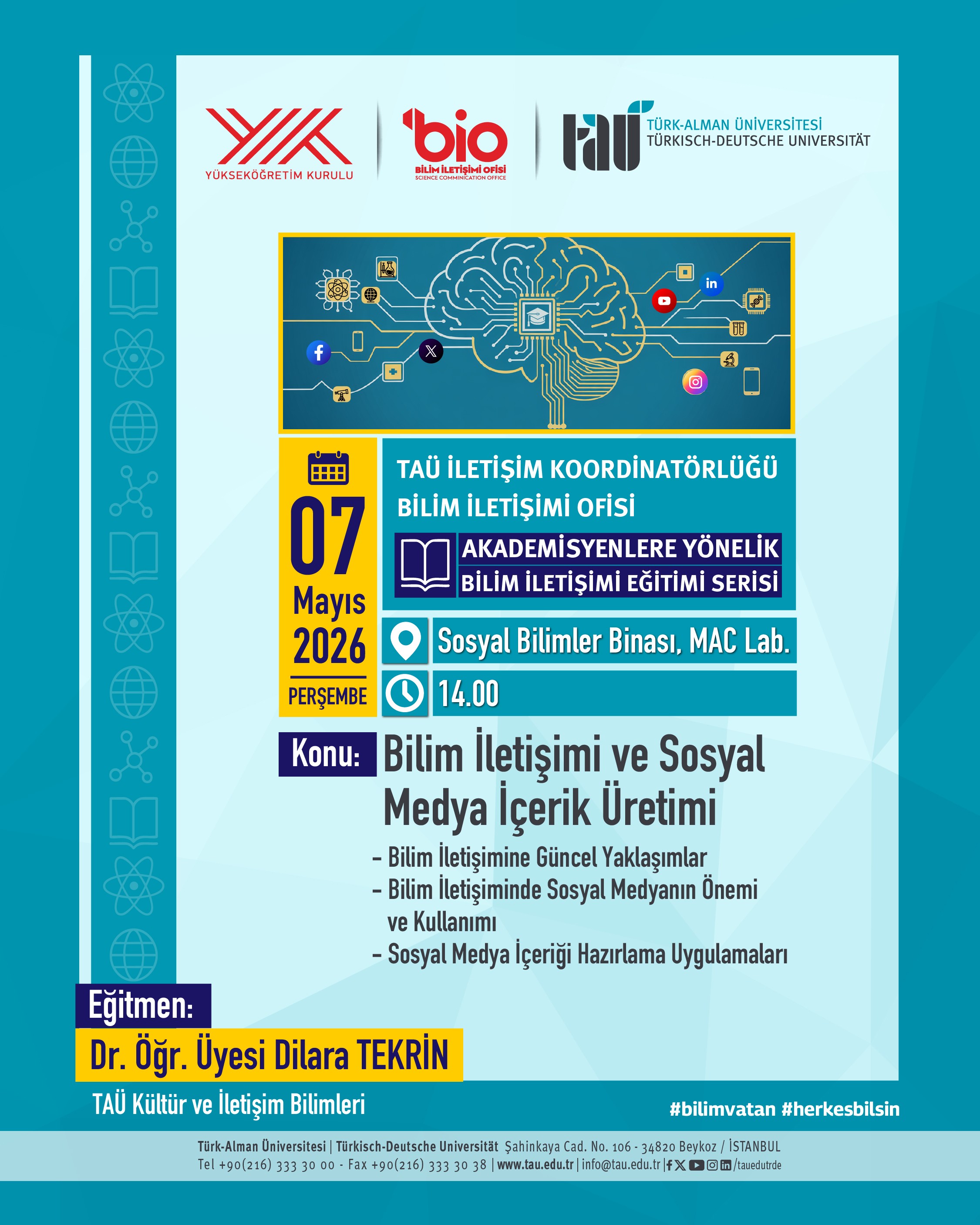 | İçerik | İletişim Koordinatörlüğümüz Bilim İletişimi Ofisi tarafından "Akademisyenlere Yönelik Bilim İletişimi Eğitimi Serisi" etkinliği düzenlenecektir. Dr. Öğr. Üyesi Dilara Tekrin'in "Bilim İletişimi ve Sosyal Medya İçerik Üretimi" konulu sunumunu katılımcılarla buluşturacağı etkinlik, 07.05.2026 saat 14.00'te Sosyal Bilimler Binası, MAC Laboratuvarı'nda gerçekleştirilecektir. Eğitime tüm akademisyenlerimiz davetlidir. |