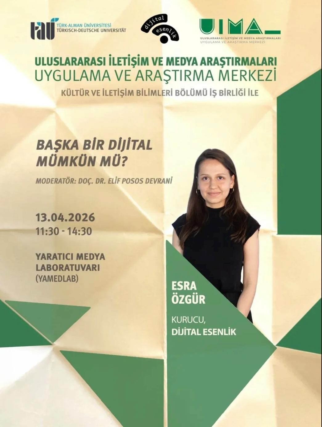| İçerik | "Başka Bir Dijital Mümkün mü?" Dijital mecraların algoritmalar ve moderasyon politikaları aracılığıyla bireysel ve toplumsal esenliği destekleyip destekleyemeyeceğini konuşuyoruz. Konuşmacı: Esra Özgür | Dijital Esenlik Kurucusu Moderatör: Doç. Dr. Elif Posos Devrani | TAÜ Kültür ve İletişim Bilimleri Bölümü Öğretim Üyesi Üniversitemiz Uluslararası İletişim ve Medya Araştırmaları Uygulama ve Araştırma Merkezi ile Kültür ve İletişim Bilimleri Bölümü iş birliğiyle gerçekleştirilecektir. |