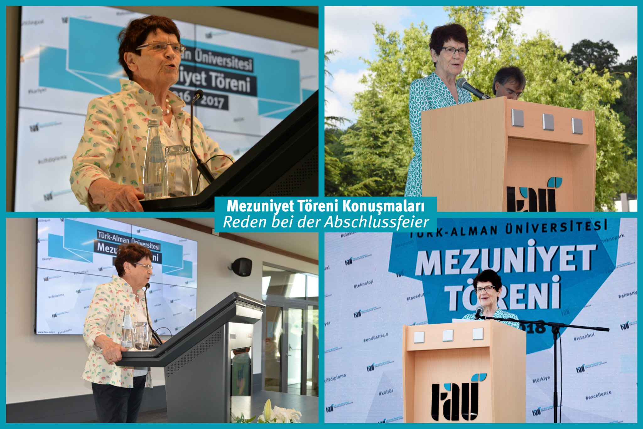 Prof. Dr. Rita Süssmuth’un perspektifinde Türk-Alman Üniversitesi, yalnızca ortak bir yükseköğretim projesi değil; farklı kültürler arasında karşılıklı anlayışı, eleştirel düşünceyi ve çoğulcu akademik geleneği besleyen stratejik bir diyalog alanı olarak konumlanmıştır. Bu yönüyle Prof. Dr. Rita Süssmuth, üniversitemizin hem disiplinlerarası yapısını hem de uluslararası akademik niteliğini belirleyici şekilde şekillendiren kuruluş fikrinin en ikna edici savunucularından biri olmuştur. Bu bağlamda Üniversitemiz tarafından Prof. Dr. Rita Süssmuth’a 25 Mart 2022 tarihinde fahri doktora ünvanı takdim edilmiştir.