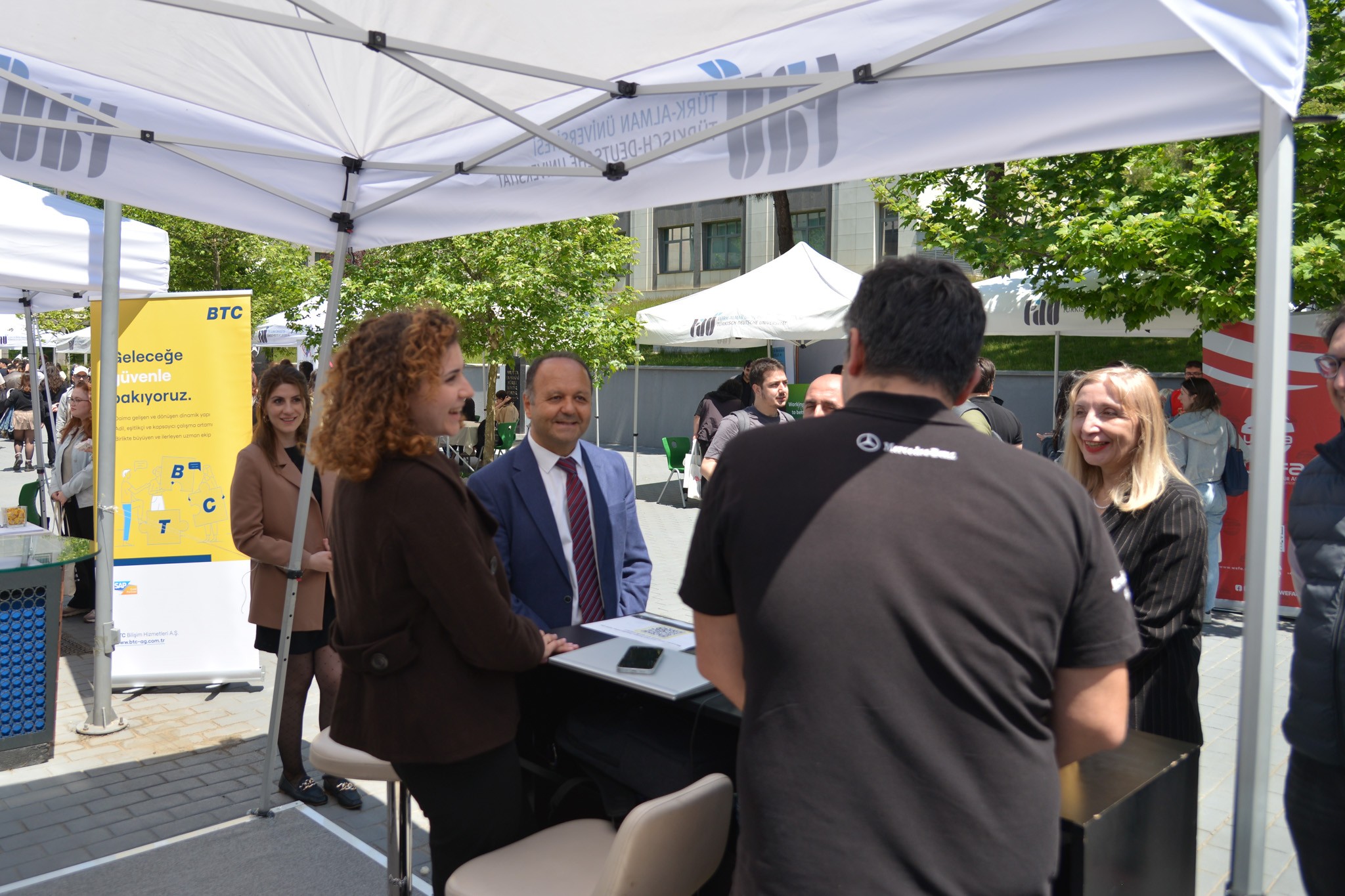 Rektörümüz Prof. Dr. Cemal Yıldız, Üniversitemiz Kariyer Merkezi ve Mezunlarla İlişkiler Koordinatörlüğü öncülüğünde, öğrenci kulüplerimizin katkılarıyla 13-14-15 Mayıs 2025 tarihlerinde düzenlenen TAÜ Kariyer Zirvesi’25 etkinliğini ziyaret etti. Rektörümüz Prof. Dr. Cemal Yıldız, Rektör Yardımcımız Prof. Dr. Aysel Uzuntaş ve Genel Sekreterimiz Özgür Ali Şirin ile katılımcı firmaların stantlarını ziyaret ederek sektör temsilcilerinden bilgi aldı, öğrenci ve mezunlarla sohbet etti. TAÜ Kariyer Zirvesi’25 kapsamında, firma yetkililerinin sunumları, kariyer stantları, paneller ve girişimcilik temalı oturumlar aracılığıyla öğrencilerimiz sektörün öncü temsilcileriyle doğrudan iletişim kurma fırsatı buldu.