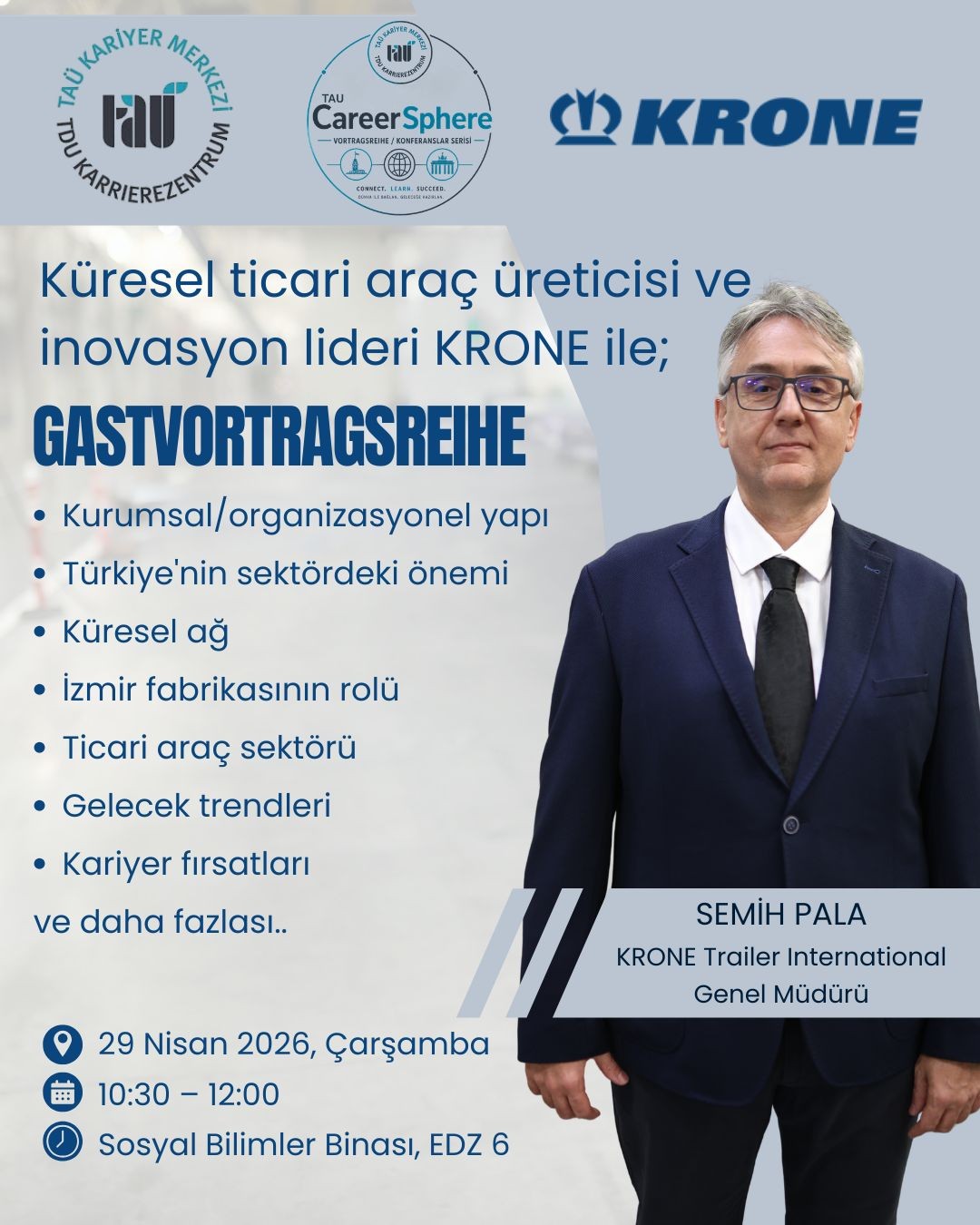 | İçerik | KRONE Trailer International Tic. Ltd. Şti. Genel Müdürü Semih Pala, ticari araç sektöründeki küresel dönüşümü, Türkiye’nin stratejik önemini ve genç profesyoneller için kariyer fırsatlarını öğrencilerimizle paylaşacak. Dijitalleşme, sürdürülebilirlik ve akıllı lojistik odağındaki etkinliğimize tüm öğrencilerimiz davetlidir.