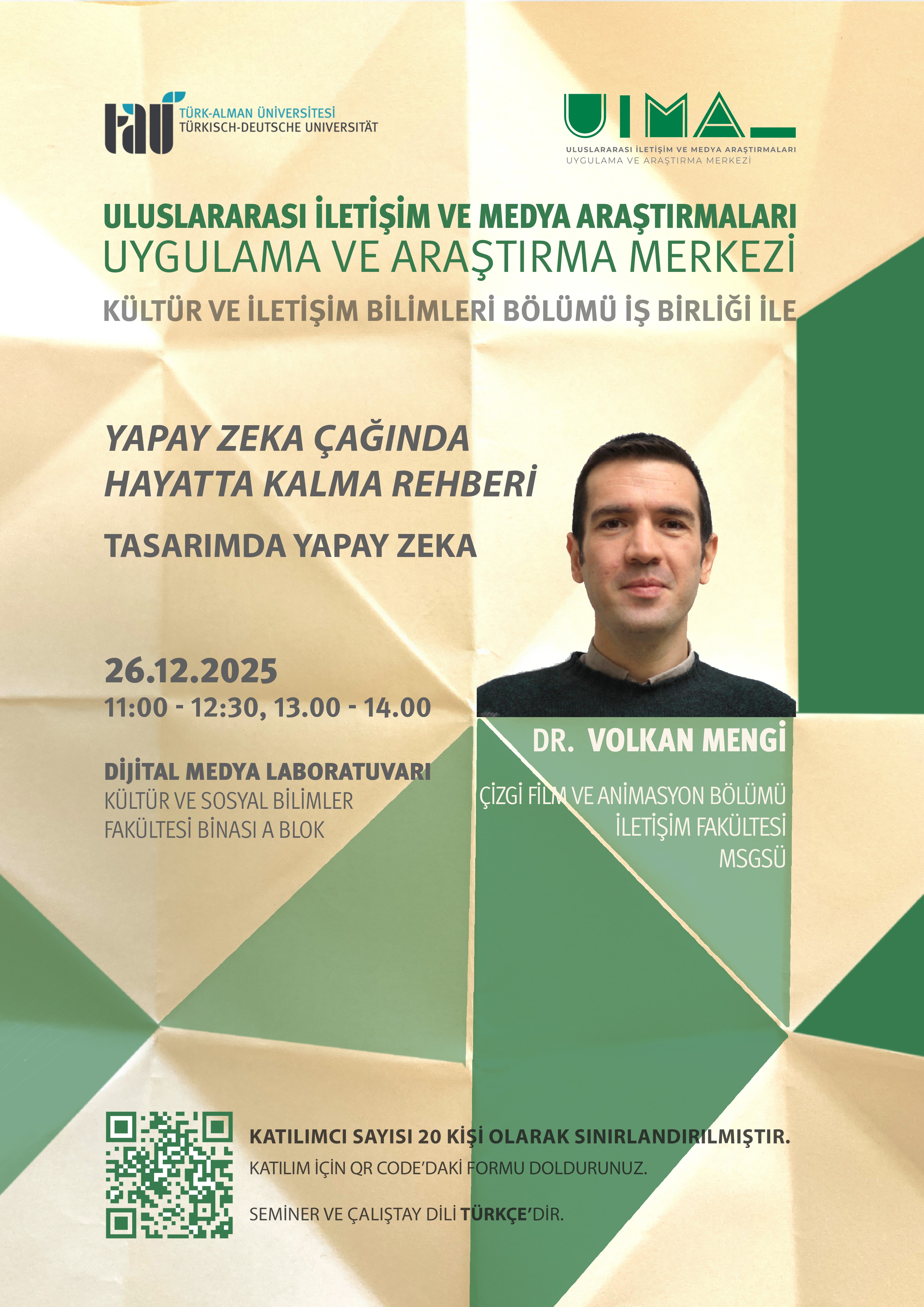 | İçerik | Yapay Zeka Çağında Hayatta Kalma Rehberi: Tasarımda Yapay Zeka başlıklı atölye çalışmasında yapay zeka araçlarının sadece bir teknoloji olmanın ötesinde, tasarım düşüncesini ve hayata geçirme süreçlerini nasıl kökten değiştirebildiği farklı bakış açılarıyla incelenecektir. Dr. Öğr. Üyesi Volkan Mengi, lisans eğitimini 2007–2010 yılları arasında University for the Creative Arts (İngiltere)’de Grafik Tasarım / Görsel İletişim alanında tamamlamıştır. 2010–2011 yıllarında London Metropolitan University (İngiltere)’de Dijital Film ve Animasyon alanında yüksek lisans yapmıştır. Sanatta yeterlik/doktora derecesini 2017–2023 yılları arasında The Hungarian University of Fine Arts’ta tamamlamıştır. 2024 yılından bu yana, Mimar Sinan Güzel Sanatlar Üniversitesi İletişim Fakültesi Çizgi Film ve Animasyon Bölümü’nde Doktor Öğretim Üyesi olarak görev yapmaktadır. |